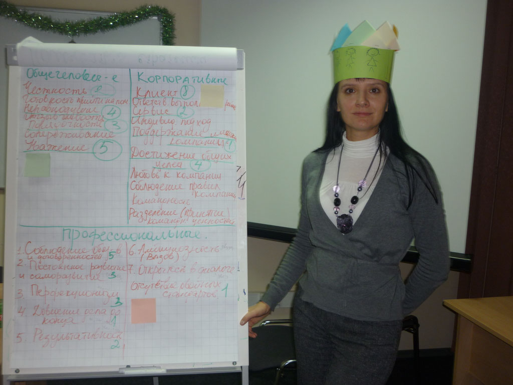 А самым большим открытием для всех нас стало задание, выявляющее существующие ценности компании: общечеловеческие, профессиональные, корпоративные. При этом, три группы участников тренинга, работая над заданием отдельно друг от друга, сформировали единую картину. Мы смотрим в одну сторону и такую «шляпу ценностей» нестыдно надеть и гордо носить. Конечно, это неслучайно - именно этими принципами мы руководствуемся при отборе в нашу команду.