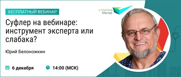 6 декабря в 14:00 по Москве наш новый эксперт проведет бесплатный вебинар «Суфлер на вебинаре: инструмент эксперта или слабака?». Первый вице-президент сообщества «Профессионалы дистанционного обучения» Юрий Белоножкин поделится с вами опытом применения суфлера для проведения вебинаров с телевизионным качеством картинки и звука.