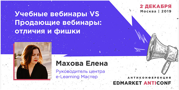 Центр e-Learning Мастер на мероприятии представляет руководитель Елена Махова. Она разберёт с участниками своей мини-группы особенности продающих и учебных вебинаров. Даст чек-листы по подготовке к ним и даже подскажет, как продавать на учебном вебинаре или учить на продающем!
