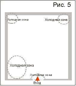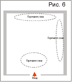 Безусловно, все вы замечали, что в каждом магазине есть как горячие зоны, в которых скапливаются максимум посетителей и через которые проходит основной поток, так и есть зоны, в которых посетителей почти нет. Это и есть горячие и холодные зоны (Рис.5 и Рис.6). Традиционно горячие зоны находятся у входа, т.к. через вход проходят все посетители, но не сразу у входа, где товар оказывается позади покупателя, правая стена и правая часть магазина, фронтальная стена с хорошим обзором от входа. Там следует размещать товары, которые нам выгодно продавать. Холодные зоны расположены сразу при входе, т.е. та часть витрин, которая находится позади покупателя, углы и левая часть магазина.