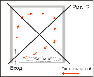 | Вход справа. Покупатели не видят витрин, но удобно перемещаются по залу. |