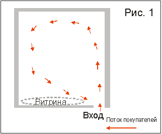 Вход в магазин лучше всего разместить справа или посередине. У каждого способа есть свои плюсы и минусы. Если мы размещаем входную дверь справа, мы автоматически направим поток покупателей более комфортным маршрутом против часовой стрелки, однако мы практически потеряем удобную для размещения товаров правую стену – она будет занята проходом. Так же мы потеряем витрину, через которую могли бы пройти покупатели, т.к. витрина остается за входом (Рис.1). Если мы будем выполнять задачу провести всех посетителей через витрины, мы вынуждены будем разместить вход слева. Однако вход слева разместить нельзя, т.к. покупателям удобнее двигаться против часовой стрелки, а не по часовой (Рис. 2).