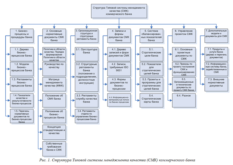 Другое интересное решение – «Типовая система менеджмента качества коммерческого банка» [2] (далее Типовая СМК банка). Типовая СМК банка – это совокупность основных компонентов СМК банка в документированном виде, которые разработаны специально для банковской отрасли и могут быть использованы в качестве эталона (типового успешного решения) для построения СМК. Структура Типовой СМК банка показана на Рис. 1.