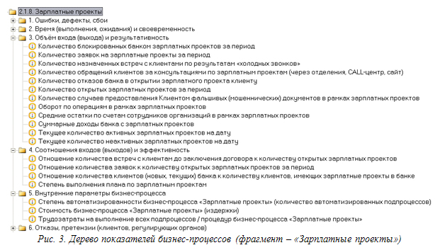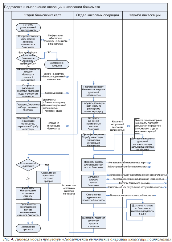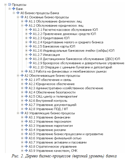 Например, многие банки при выделении и описании бизнес-процессов за основу берут типовое дерево бизнес-процессов и модели. Из дерева вычёркивают бизнес-процессы, которых в банке нет, добавляют бизнес-процессы, которые в дереве отсутствуют, но есть в банке. Далее при деталь-ном (графическом) описании бизнес-процесса сначала изучают его типовую модель, а затем уже проводят интервью исполнителей и изучают нормативные документы банка. При этом типовая модель бизнес-процесса дорабатывается под специфику банка, а не «рисуется» с нуля. Разработка показателей для бизнес-процесса также не является проблемой, если есть перечень типовых показателей. Не нужно придумывать то, что уже давно известно и применяется в других банках (т.е. «изобретать велосипед»).