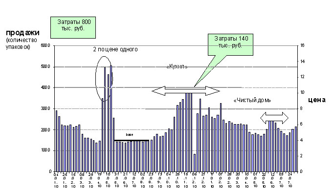 На приведенном рисунке показан пример влияния трех трейд-маркетинговых мероприятий на продажи бытовой химии. Акции отличаются по уровню и длительности роста продаж. Максимальный «всплесковый» рост продаж (так называемый предварительный эффект акции) наблюдается по акции типа «мультпокупка» - «два по цене одного. Разница между первоначальным Предварительный эффект отслеживается по разнице между базовым уровнем продаж и максимальными продажами во время акции. Чем больше показатель дополнительных продаж (разница между максимальным значением продаж во время акции и базовым значением продаж), тем выше эффект акции.