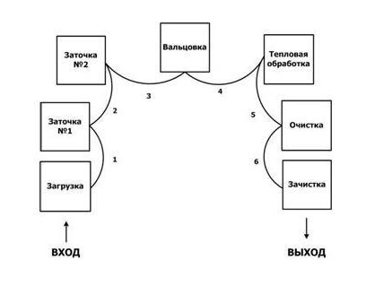U-образные ячейки - Расположение оборудования в форме латинской буквы «U». В U-образной ячейке станки расставлены подковообразно, согласно последовательности операций. При таком расположении оборудования последняя стадия обработки проходит в непосредственной близости от начальной стадии, поэтому оператору не нужно далеко ходить, чтобы начать выполнение следующего производственного цикла.