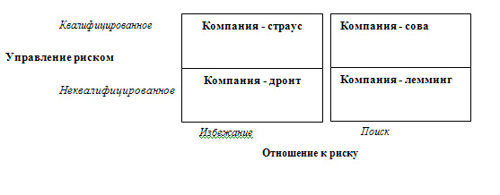 Существует и другой подход к тому, как компании рассматривают риск. В его основе лежит матричный способ комбинирования двух полюсов: отношения к риску и управления риском.