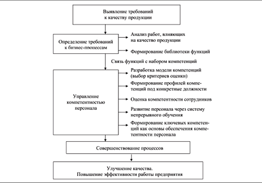 В рамках системы менеджмента качества в соответствии с требованиями ГОСТ Р ИСО 9001 п. 6.2.2 «Компетентность, осведомлённость и подготовка»: «Организация должна определять необходимую компетентность для персонала…, обеспечивать подготовку…, оценивать результативность предпринятых мер. Это должно включать определение применимых, подходящих методов мониторинга, которые должны демонстрировать способность процессов достигать запланированных результатов». Следовательно, с целью управления компетентностью персонала предприятия необходимо (рис. 1):