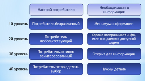 И, наконец, на четвертом уровне, когда потребитель готов сделать покупку, необходимость в информации огромна. Потребитель готов воспринять всю информацию, которой продавец готов поделиться, соблюдая при этом зону комфорта покупателя.