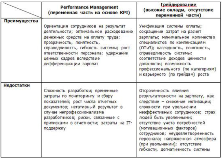 Считается, что система Performance Management способствует росту результативности бизнеса. Одна из ее основных составляющих – система компенсации, при которой размер вознаграждения сотрудников (ее переменная часть) зависит от степени достижения ими своих целей и задач (KPI –ключевых показателей эффективности). Второй подход – грейдирование – не подразумевает ежемесячной или ежеквартальной переменной части, но работнику раз в год может быть начислен бонус, зависящий от результатов деятельности всей компании. Рассмотрим, каковы преимущества и недостатки указанных систем (см. таблицу).