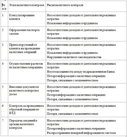 Риски валютного контроля можно разделить на две группы — внутренние и внешние. Внутренние риски представляют собой сферу анализа и управления, в которой действия организации могут принести реальное улучшение ведения валютного контроля. Что касается внешних рисков валютного контроля, то они проявляются в трудностях функционирования самого механизма валютного контроля. Наибольшее количество рисков приходится на операции по расчетам. Часто встречаются риски: несоответствия доходов от внешнеэкономической деятельности реальным затратам; искажения и потери информации по валютным операциям. Поэтому при организации валютного контроля данным аспектам необходимо уделять повышенное внимание (см. таблицу).
