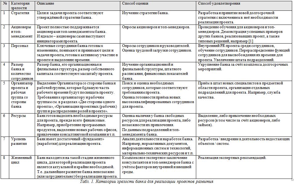 Определить зрелость банка для реализации проекта достаточно просто. Для этого необходимо оценить каждую категорию из Табл. 1, поставить по ней плюс или минус. Затем сложить количество плюсов и получить уровень зрелости.