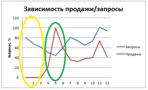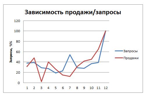 Компания: производитель, работает через оптовый канал. Значительная часть продуктов (что важно) продается через offline магазины. Ниже представлен график, где представлены результаты продаж и количества запросов. Статистика запросов получена через wordstat.yandex.ru Статистика очищена от «левых» запросов, не относящихся к продукту. Все цифры представлены в процентах, где 100% — наибольшая встречающаяся величина. Среднее количество запросов в месяц – несколько тысяч.