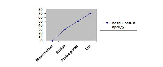 Bridge – лояльность клиентов этого сегмента намного ниже. В период экономического кризиса, ЦА может временно покинуть его и уйти в сегмент Mass-market. Bridge дает своему клиенту моду, но с переориентацией на собственный индивидуальный стиль.