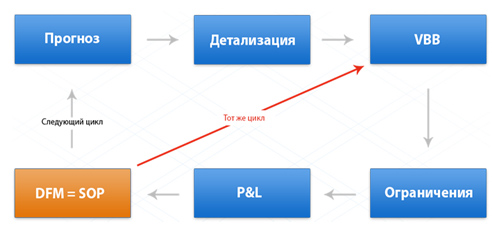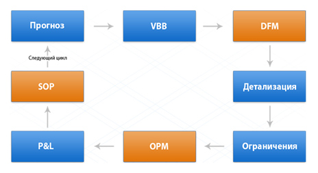 Каждый шаг сопровождается соответствующей встречей ответственных сотрудников. Сначала создается прогноз спроса. Затем его нужно обсудить, выслушать различные экспертные мнения и принять окончательное решение. Для этого ответственные сотрудники компании собираются на встречу по прогнозированию спроса (Demand Forecast Meeting, DFM). Согласно современным подходам к планированию нельзя изменять полученный с помощью математических моделей прогноз без веских на то оснований. Иными словами, увеличить (или уменьшить) прогноз можно только если компания понимает, за счет каких мероприятий это произойдет. Приросты продаж от проведения таких мероприятий в английской терминологии обычно называются Volume Building Blocks (VBB). Эту тему мы подробно разберем в статье, посвященной прогнозированию спроса.