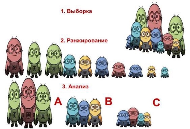 Данный вид анализа основан на правиле Парето (20% действий, товаров, поставщиков дают 80% результатов) и позволяет выделить группы, которые в наибольшей или наименьшей степени влияют на достижение результата. При объяснении сущности АВС-анализа на своих семинарах я иногда использую визуализацию (рисунок 1). Решение, на мой взгляд, удачное. Подготовленные слушатели получают от таких забавных картинок положительные эмоции, как от хорошего анекдота. Неподготовленные – лучше понимают, о чем идет речь: для получения результата значительно эффективней работать с сильными товарами – категорией «А». С категорией «С» много возни, а результат будет минимальным.