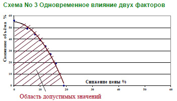 Подобрав такие пары значений цены и объема, чтобы попасть в точку финансового нуля, мы можем построить функцию, которая примерно будет выглядеть как на схеме №3. При этом по оси Х откладывается снижение цены в % от первоначально запланированной, а по оси Y снижение объема.