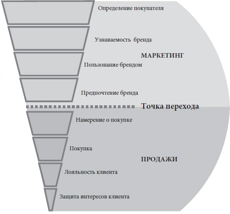 Отдел маркетинга обычно отвечает за несколько первых этапов работы с клиентом: повышение уровня узнаваемости и предпочтения бренда, пробуждение интереса потребителя к бренду, создание маркетингового плана и привлечение потенциальных клиентов. Затем за дело берется отдел продаж, который приводит маркетинговый план в исполнение и контактирует с клиентами. Такое разделение труда очень эффективно: маркетинг не вмешивается в индивидуальные продажи, и у него остается больше времени и сил на разработку стратегии. Опасность в том, что если продажи низки, то продавцы могут обвинить маркетологов в том, что их план уж слишком мал, а маркетологи на это ответить тем, что продавцы работали недостаточно усердно или неправильно. В этом случае маркетинговая служба на время теряет контакт с активными клиентами, а отдел продаж создает собственную воронку продаж с описанием последовательности шагов. Такая воронка, интегрированная в системы CRM, прогнозирования продаж и анализа работы с клиентами, становится хребтом процесса управления продажами. К сожалению, в этом процессе службе маркетинга не находится никакого места.