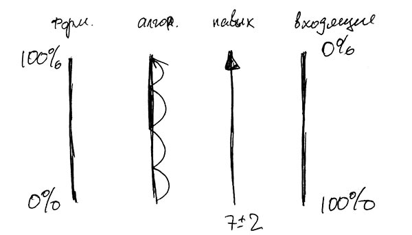 Но вернемся к нашей схеме. Чем выше вы поднимаете ползунки вверх и чем большее количество ползунков вверху, тем больше вы можете успеть перелопатить дел. Чем ниже расположены ползунки и чем большее их количество занимает нижнее положение, тем меньше шансов хоть что-то полезное выполнить за целый день работы. Получается, что от формализации задачи зависит многое, но не все. Второй ползунок – эффективность алгоритмов.