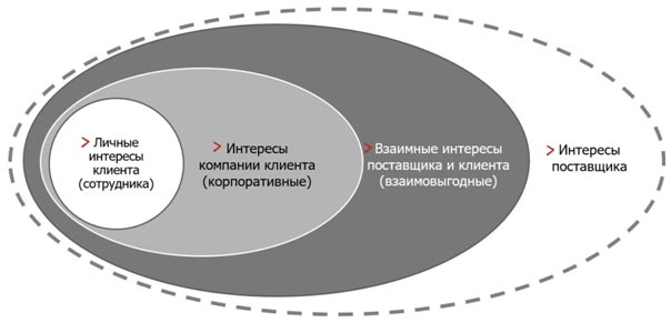 Выявить персональные (личные) интересы клиента в В2В непросто, но нужно понимать, что любые усилия, направленные на то, чтобы разобраться, что лежит в основе покупки, всегда окупятся. Вот далеко не полный перечень личных интересов, которые движут поступками клиентов и которые для отдельно взятого человека приоритетнее корпоративных интересов компании: