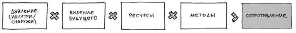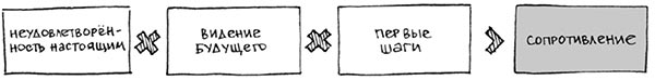 Как же тренеру решить такую задачу? Важно понимать механизм процесса изменения установок и поведения у людей в целом: если произведение трех составляющих — неудовлетворенности текущим положением дел, видения возможностей и первых конкретных шагов, которые могут быть сделаны в направлении цели, — превосходит сопротивление, то изменения возможны. Такова формула внедрения изменений (формула Глейтчера), которая графически может быть представлена следующим образом:
